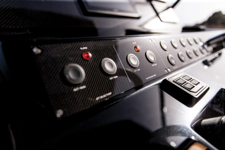 CABINA, BAÑO CON DUCHA E INODORO ELÉCTRICO CON AGUA DULCE, INTERIOR EN ROBLE, 2 MOTORES DE GASOLINA VOLVO V6 280 CV CON PIE DE PUNTA CON DIRECCIÓN ELECTRÓNICA, T-TOP NEGRO ESTÁNDAR EN CARBONO, RAYAS CON CASCO NEGRO ESTÁNDAR, TELAS EXTERIORES (SILVERTEX) HIELO)
